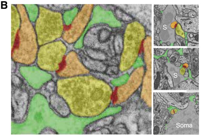 Figure 2. Leaflets are the astrocyte’s specialized subdomains that interact with synapses and preferentially embed multiple vs. individual synapses. (B) Arrangement of synaptic elements with leaflets and other astrocyte structures; 2D FIB-SEM images overlaid with segmentation map (leaflet: green; axonal bouton: yellow; spine: orange; synaptic cleft: red). Left: five synapses encompassed in a leaflet domain, contacted by leaflet units. Bar: 0.5 μm. Top right: synapse in direct contact with a shaft (S, gray); bar: 0.5 μm. Middle right: synapse in contact with both leaflets emerging from a shaft and the shaft itself; bar: 0.5 μm. Bottom right: synapse in contact with leaflets emerging from cell body (soma). Bar: 1 μm.