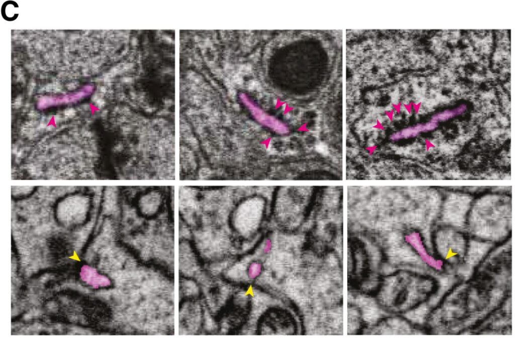 Figure 3. i-ER: Minuscule organelles observed specifically in the leaflet domains of astrocytes. (C) Examples of i-ER saccules (magenta overlaid to EM images). Top: i-ERs surrounded by associated ribosomes (magenta arrowheads). Bottom: i-ERs contacting the astrocyte plasma membrane (yellow arrowheads). Bar: 500 nm.