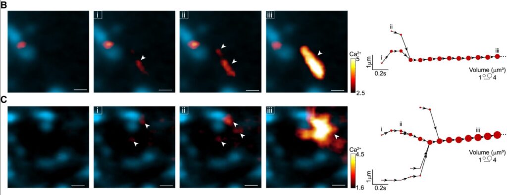 When they merge, these signals create broader calcium waves capable of synchronizing several neighboring synapses.