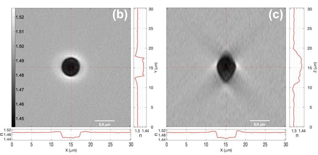 While a 5 µm silica bead is correctly imaged as a circular object in the transverse plane (Fig. 1(b)), the longitudinal view (Fig. 1(c)) shows a stretched object, which borders appear to “vanish” along the optical axis (z-axis).