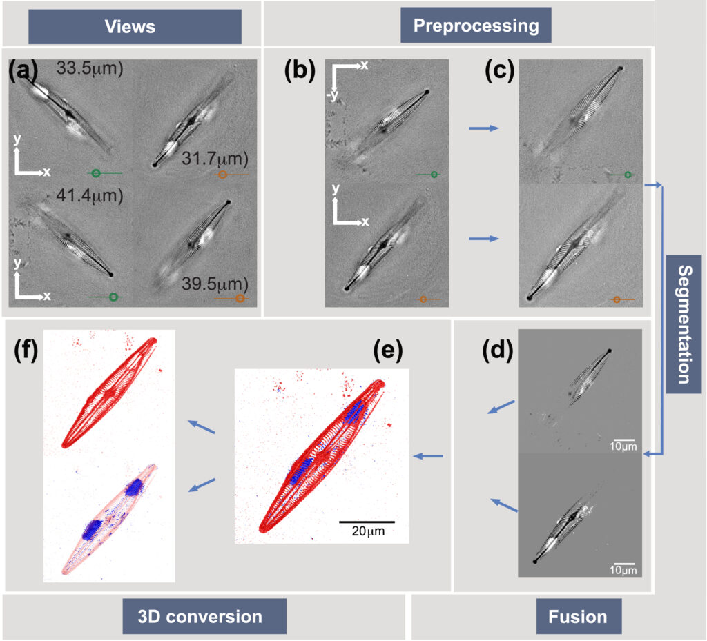 Dual-view TDM is particularly well suited for the label-free imaging of structurally complex samples, where conventional TDM may fail to provide reliable results. Typical applications include the study of samples such as diatoms and pollen grains, whose intricate surface features and internal compartments require homogeneous image quality across the entire sample. The method could also be relevant for small 3D cellular assemblies or spheroids, where depth-dependent signal degradation limits quantitative analysis.