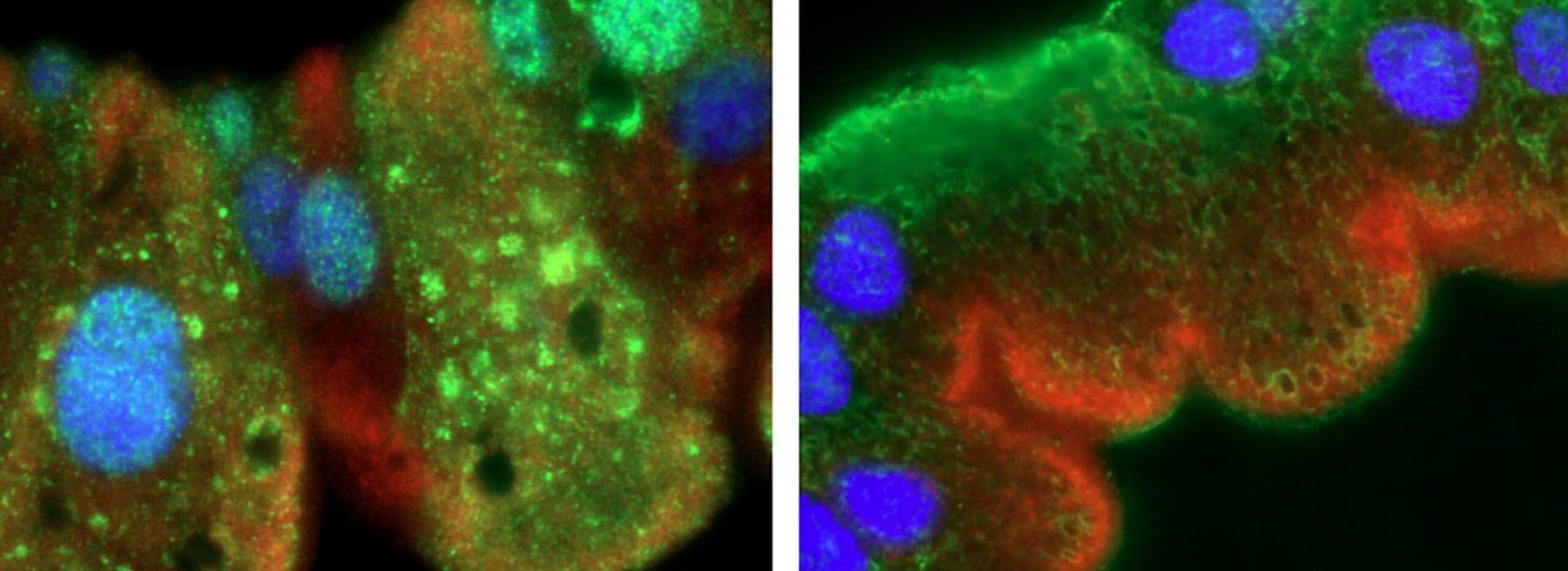 (C) Apical side of a gut epithelial cell with endocytic vesicles.
