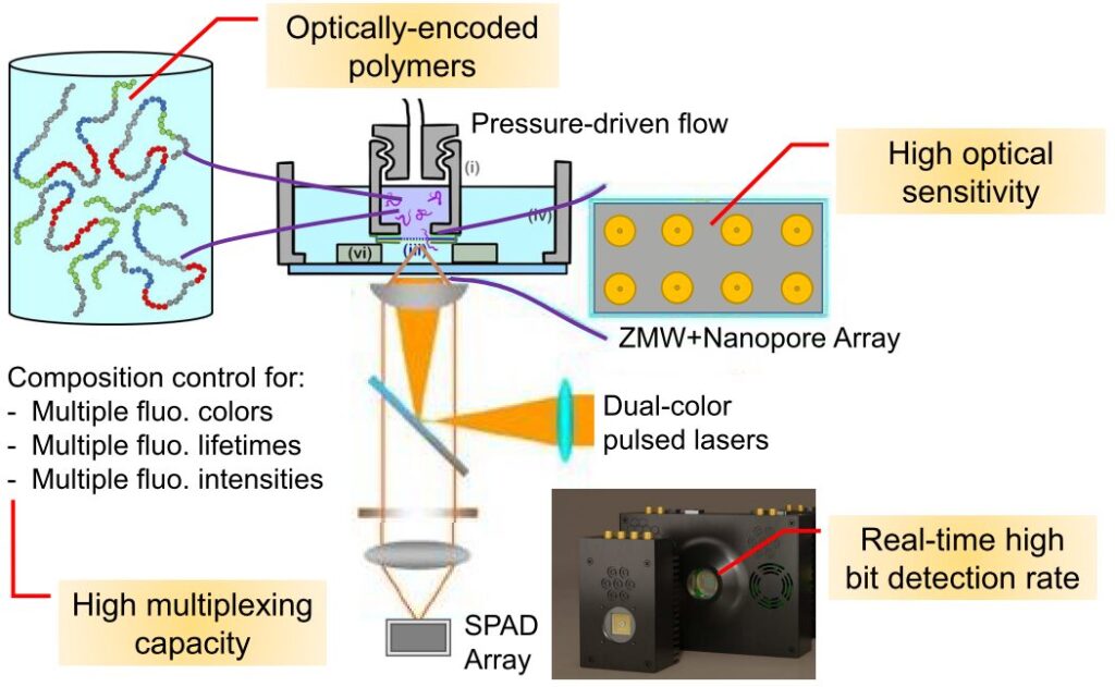 Our transdisciplinary consortium of 3 laboratories (Ingénierie des Matériaux Polymères, Lyon; Laboratoire de Physique de l’ENS de Lyon ; Institut Fresnel, Marseille) aims to explore a novel approach involving the development of fluorescently encoded synthetic polymers and also DNA origamis, combined with an optical sequencing technique that enables faster reading of their controlled sequence. Our main goal is to set up an innovative platform based on the real-time optical sequencing of digital synthetic and natural polymers (Figure 1). Departing from current mass spectrometry and electrical approaches, this project aims at exploring the possibilities offered by an optical readout, taking advantage of fluorescent-coded molecules and single photon counting detectors.