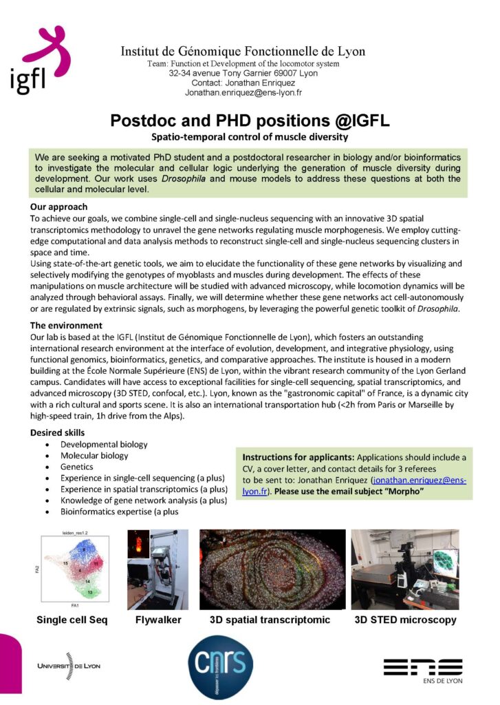 The “Development and function of the neuromuscular system” team is looking for a motivated PhD student and a postdoctoral researcher in biology and/or bioinformatics to investigate the molecular and cellular logic underlying the generation of muscle diversity during development. Their work uses Drosophila and mouse models to address these questions at both the cellular and molecular level.